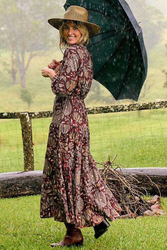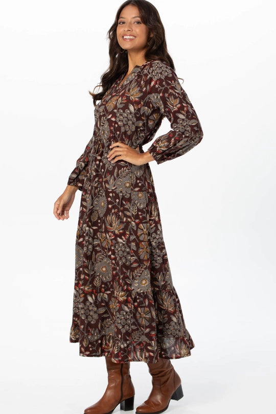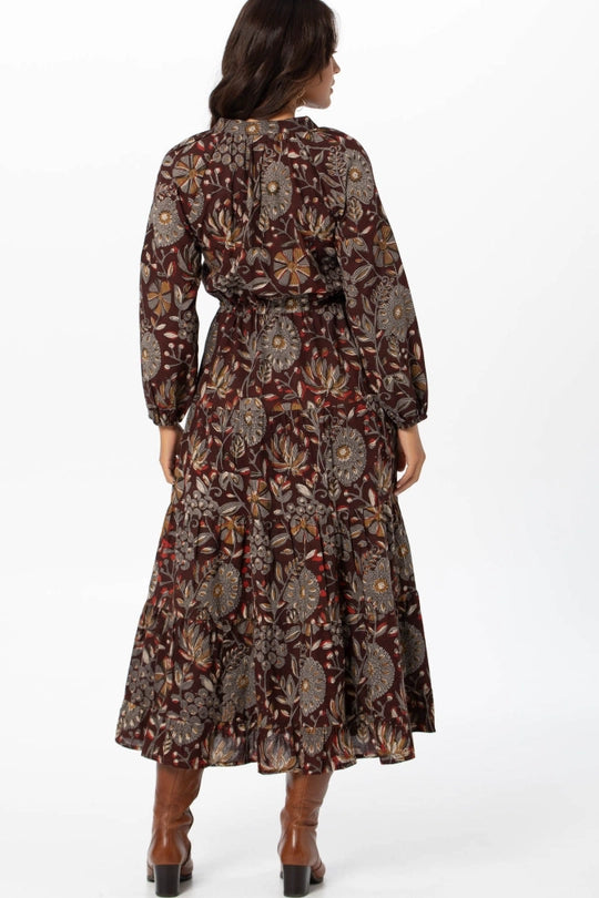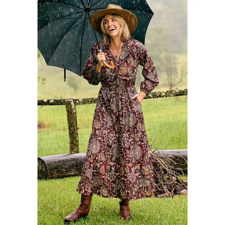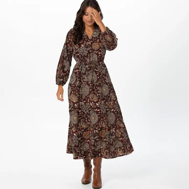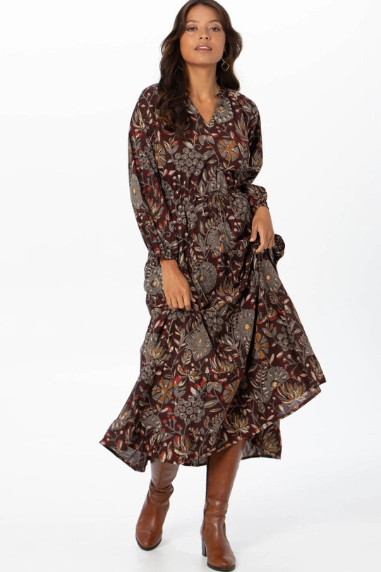 Asha Maxi is a generous, v neck maxi with drawstring waist for customisable fit & raglan sleeves for a relaxed silhouette. Featuring hidden side pockets & adorned with the subtle Ikebana hand block print using Dabu technique. Crafted from 100% Cotton Asha is a blend of comfort & style. The tiered skirt adds a touch of flair while allowing for ease of movement.